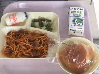 今日の給食献立は、イタリアンスパゲッティ・グリーンアスパラガスとキャベツのサラダ・発酵乳・黒糖パン・牛乳です。
