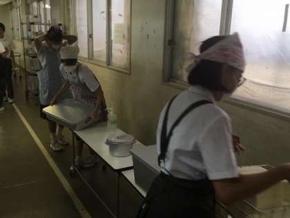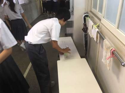 4時間め終了後、まずは配膳台アルコール消毒することから始まります。係の生徒が、エプロン・帽子・マスクをして、準備をしてから配膳をします。