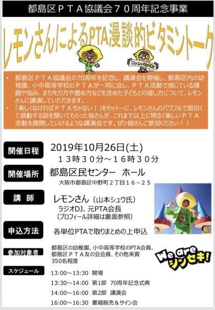 70周年を記念して10月26日(土)に、都島区内のPTA会員を対象に記念講演会を実施します。講師にはNHKのEテレ番組「バリバラ」等でも活躍されているレモンさん(山本シュウ氏)をお招きします。