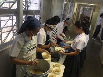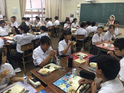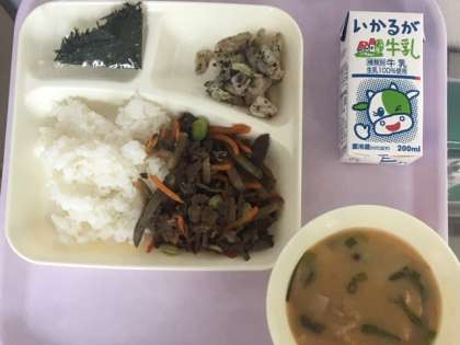 今日の給食献立は、ごはん・牛肉のきんぴらちらし・きざみのり・キャベツの赤じそあえ・みそ汁・牛乳です。
