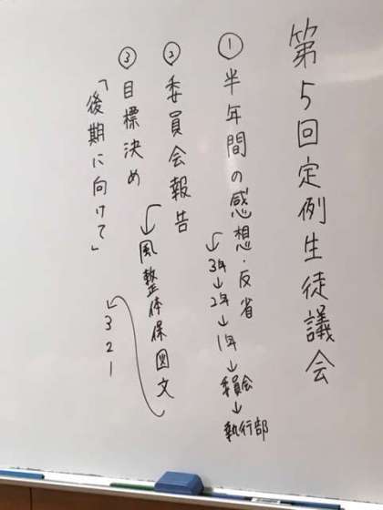 定例生徒議会です。今回は前期最終の生徒議会です。各委員長一人一人が、前期の活動に関しての感想・反省を述べました。