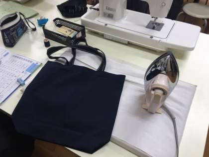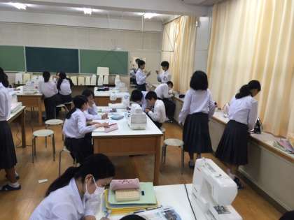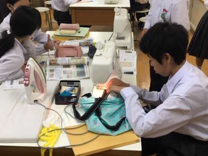 1年生の家庭科の授業では、トートバッグを制作しています。布の色や柄は、それぞれ選べます。無地や柄物など様々です。みんな、上手にミシンがけをしていました。