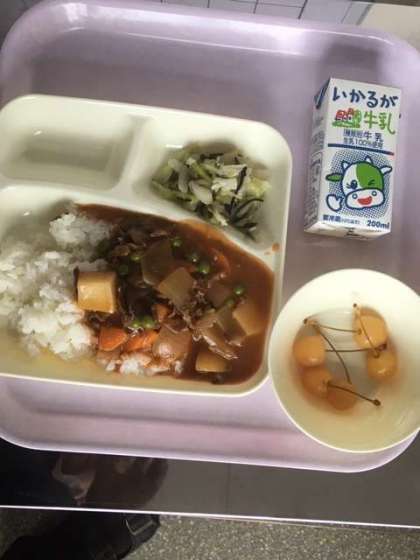 今日の給食献立は、ハヤシライス・キャベツのひじきドレッシング・さくらんぼ・牛乳です。