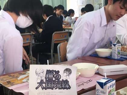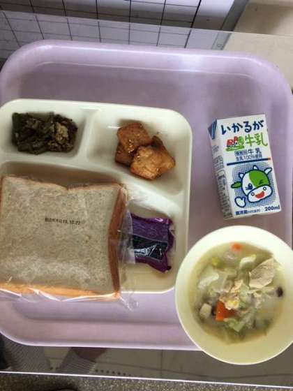 今日の給食献立は、食パン・白菜のクリーム煮・厚あげのごまじょうゆかけ・豚肉とさんどまめのオイスターソース炒め・ブルーベリージャム・牛乳です。