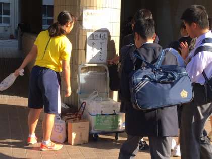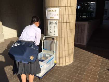 放課後、生徒たちと一緒にタオルとぞうきんの仕分けをして、おおよその枚数を数えます。