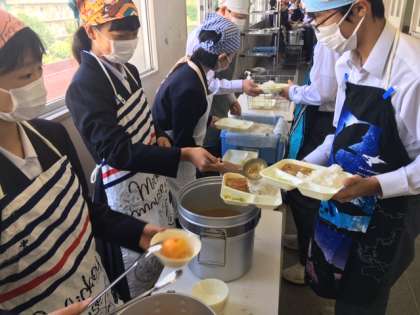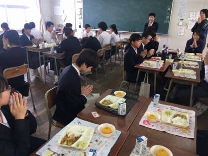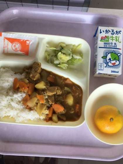 今日の給食献立は、ポークカレー・キャベツのサラダ・みかん・牛乳です。