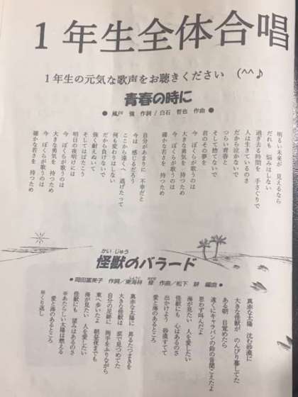 1年生の全体合唱曲は、次の2曲です。