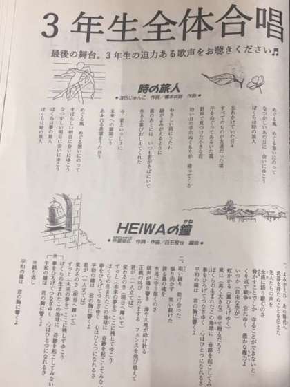 「HEIWAの鐘」 〜僕らの生まれたこの地球に 奇跡を起こしてみないか 拳をひろげてつなぎゆく 心はひとつになれるさ 平和の鐘は 君の胸に響くよ〜