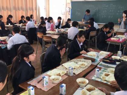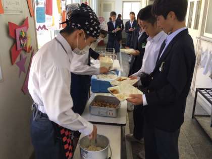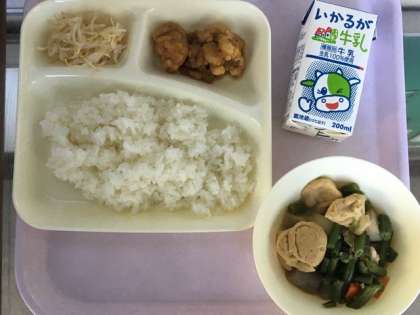 今日の給食献立は、ごはん・揚げ鶏のねぎだれかけ・含め煮・もやしのゆずの香あえ・牛乳です。