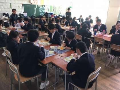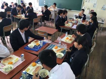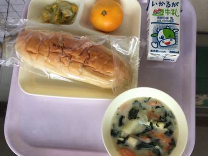 今日の給食献立は、おさつパン・ホタテ貝のクリームシチュー・キャベツとコーンのサラダ・みかん・牛乳です。