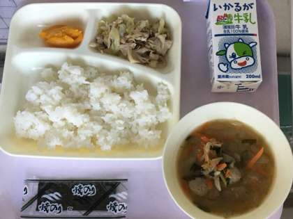 今日の給食献立は、ごはん・豚肉と舞茸の炒めもの・つみれ汁・かぼちゃのういろう・焼きのりです。