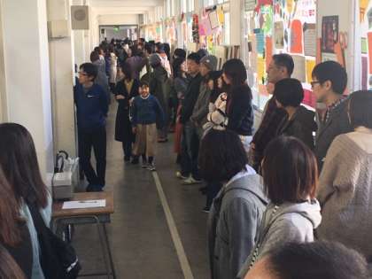 教室は、もともと生徒の机で余裕がなく、保護者の皆さんは廊下から参観をしてくださっています。廊下は満員電車のようになっています。申し訳ございません。