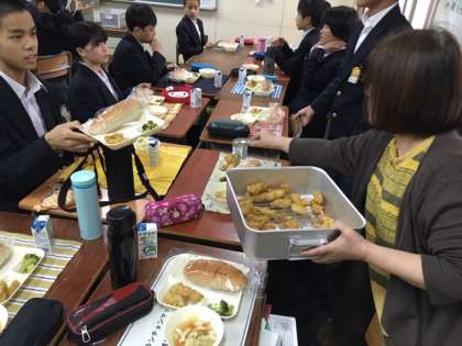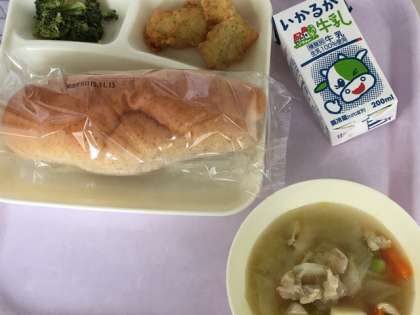 今日の給食献立は、ライ麦パン・白身魚のフリッター・ブロッコリーのサラダ・スープ煮・牛乳です。