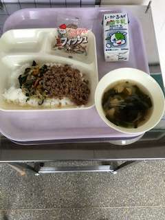 今日の献立は牛乳・ビビンバ(ごはん)・わかめスープ・アーモンドフィッシュです。
