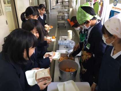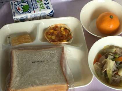 今日の給食献立は、食パン・変わりピザ・豚肉とキャベツのスープ煮・マーマレード・みかん・牛乳です。