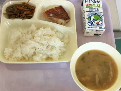 今日の給食献立は、ご飯・赤魚の醤油だれかけ・きんぴらごぼう・みそ汁・牛乳です。