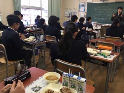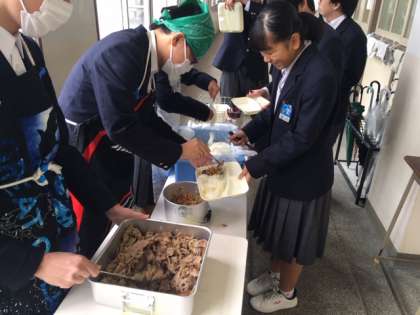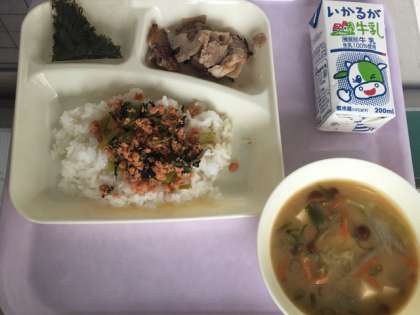 今日の給食献立は、鮭と小松菜のご飯・豚肉とれんこんの甘辛焼き・冬野菜のみそ汁・牛乳です。
