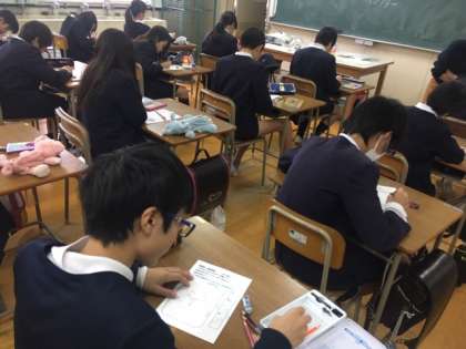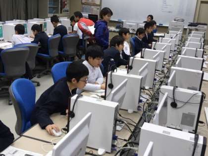 技術コースでは、パソコン教室で電子新聞の制作に取り組みました。実際に中学3年生で取り組んでいる内容の体験です。