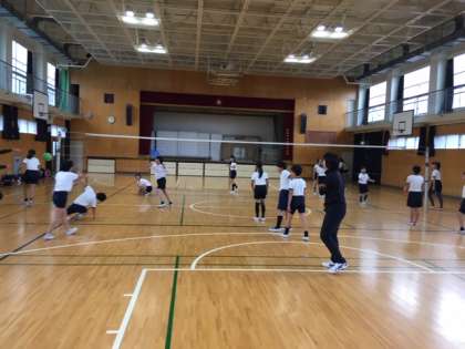 体育1コースでは、ソフトバレーボールで汗を流しました。50分で試合ができるまでずいぶんと上手になりました。