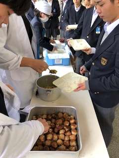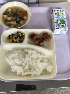 今日から12月。最初の献立は、ごはん・牛乳・あげシューマイ・とうふのスープ・ツナとチンゲンサイのいためものです。