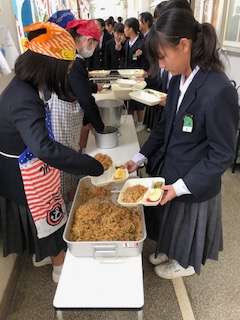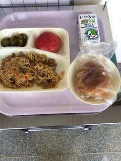 今日の給食の献立は、黒糖パン(2分の1)・牛乳・オイスターソース焼きそば・きゅうりの中華あえ・りんごです。