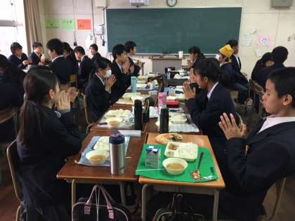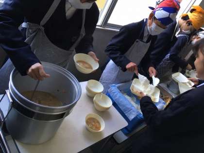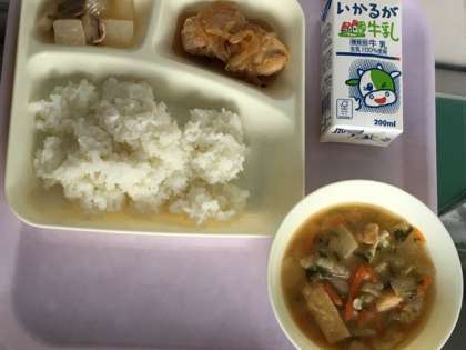 今日の給食献立は、ごはん・鶏肉の甘辛焼き・大根の煮物・みそ汁・牛乳です。