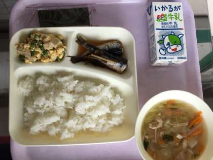 今日の給食献立は、ごはん・いわしのしょうが煮・高野どうふの卵とじ・焼きのり・うすくず汁・牛乳です。