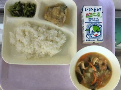 今日の給食献立は、ごはん・さばのみぞれかけ・こまつ菜の煮びたし・みそ汁・牛乳です。