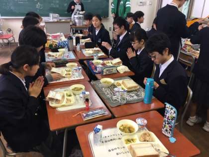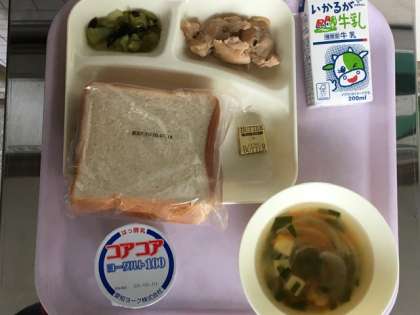 今日の給食献立は、食パン・バター・鶏肉のオイスターソース焼き・チンゲンサイのピリ辛あえ・海老と豆腐のスープ・ヨーグルト・牛乳です。
