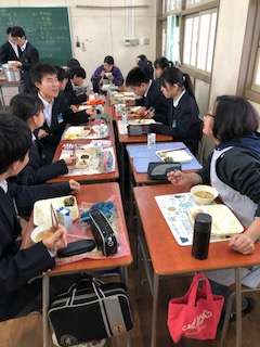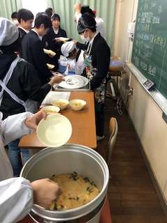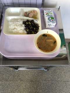 今日の給食は、学校給食献立コンクール最優秀賞に輝いた給食です。献立は牛乳・栄養たっぷりえだまえひじきご飯・さけのさわやかレモン焼き・冬野菜のみそ汁です。
