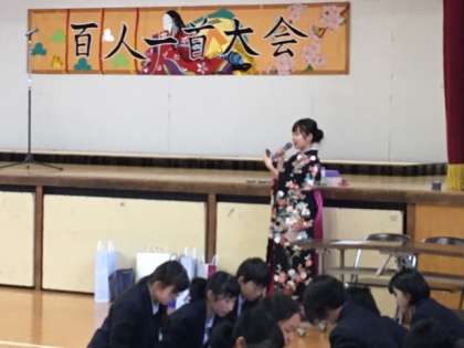 普段は格技室にて柔道でお世話になっている畳を体育館に運び込み、太鼓は友渕小学校からお借りしてきて、午後、一年生の百人一首大会が始まりました。