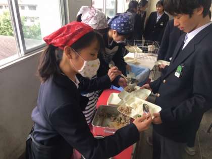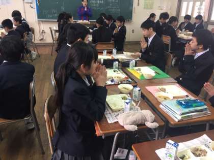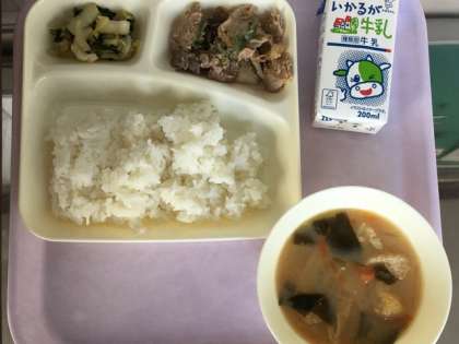 今日の給食献立は、ご飯・豚肉のごまだれ焼き・きくなと白菜のおひたし・みそ汁・牛乳です。
