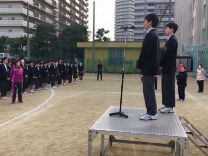 学校長の講話の後、今日は保健委員会からの話がありました。3年生の前委員長から、この季節に大切な風邪予防について話してくれました。手洗い、うがいや、食生活、睡眠など自己管理が一番大切、とノーペーパーで、しっかりと笑いも取っての演説でした。話が終わった時には拍手も起こりました。