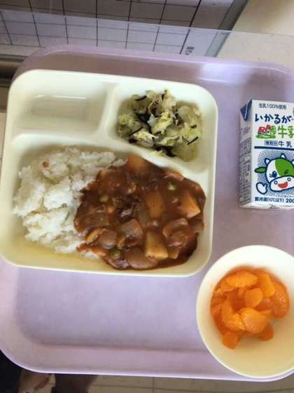 今日の給食献立は、ハヤシライス・キャベツのひじきドレッシング・缶詰めみかん・牛乳です。