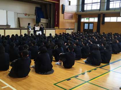 水曜日は1年生の学年集会の日です。今日は、再来週に行う韓国・朝鮮の文化に触れる取り組みに向けて、国際クラブ ピンナリクンジの仲間からプレゼンをしてもらいました。