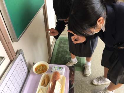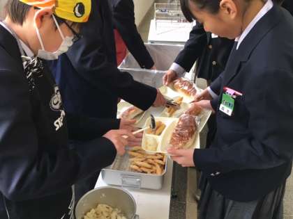 今日の給食献立は、おさつパン・わかさぎフライ・カリフラワーのサラダ・はくさいのスープ・スライスチーズ・牛乳です。
