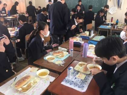 写真は、「いただきます」直後、おかずの量の調整をするために席を立っていくところです。立ち歩いて食べてるわけではありません。あしからず。