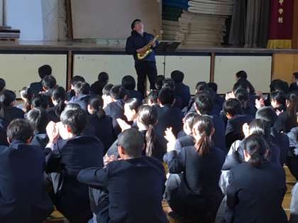 上手くいかず、何度もつまりながらですが、なんとか一曲を吹き上げました。生徒のみんなからは大きな拍手です!