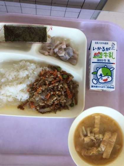 今日の給食献立は、鶏ごぼうご飯・焼きれんこん・焼きのり・みそ汁・牛乳です。