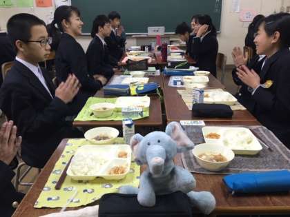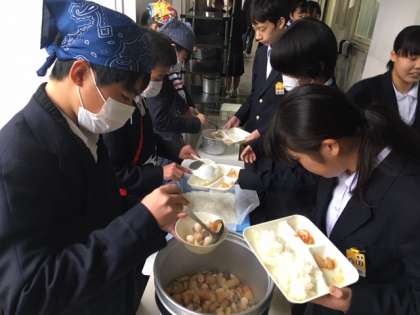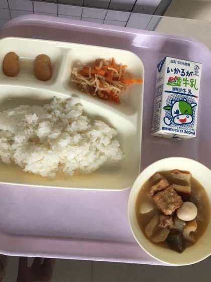 今日の給食献立は、ご飯・関東煮・もやしと人参の甘酢和え・白花豆の煮物・牛乳です。