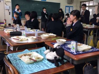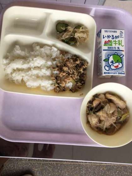 今日の給食献立は、ご飯・すき焼煮・ツナっ葉炒め・もやしときゅうりの生姜漬け・牛乳です。