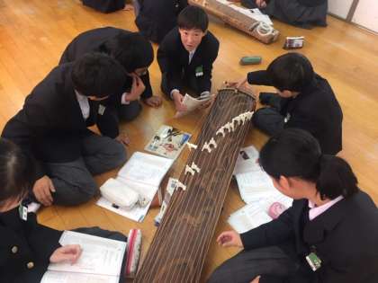 4時間め。音楽室では1年生の授業で、お琴の学習をしていました。班ごとに1張のお琴で順番に練習をします。男女問わず仲良く教え合いながら、楽しそうにやっていました。