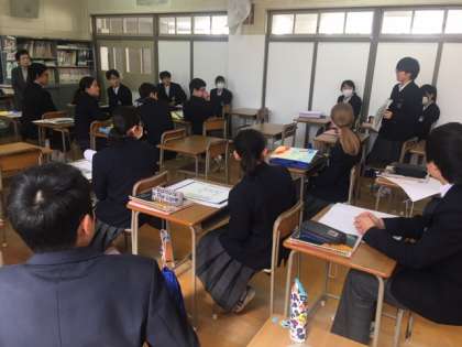美術室では3年生の授業で、2年生の時に描いたデッサンについての説明を一人ずつしてくれていました。