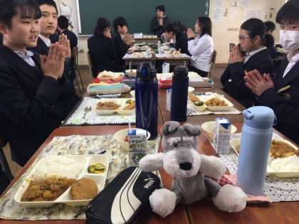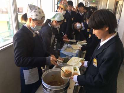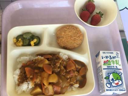 今日の給食献立は、ポークカレーライス・チキンレバーカツ・きゅうりのとコーンのサラダ・いちご・牛乳です。