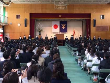 感染症防止対策で、体育館の窓を全開し、寒い中ですが、227名の新入生は元気に入場しました。体育館2階の窓から、満開に咲いた校庭の桜が見えていました。