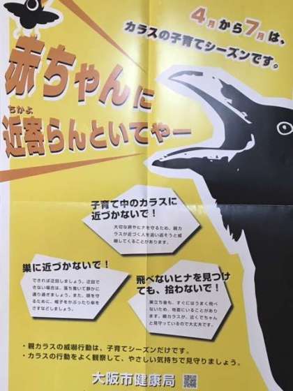 カラスの姿をよく見ます。今はポスターの通り「カラスの子育てシーズン」なので、刺激しないようにしましょう。