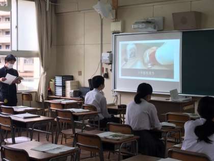 今日は3年生です。各クラスを3グループに分けて1時間ずつで行います。今日の主題は「これからの新しい学校生活の仕方」です。感染症についての学習と、感染予防のために大切なことをきっちりと学習しました。