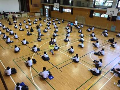 今日は1年生と3年生の登校日です。1年生は、前半クラスと後半クラスに分けて体育館で行いました。宿題の提出やプリントの配布などをしてから、「感染防止のための生活について」を画面を見ながら学習しました。