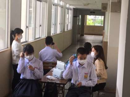 3年生は、各クラス3分割の小人数で教室で学級活動を行いました。合間に聴力検査を廊下で行いましたが、感染防止策として毎回、皮膚に触れる装置類の消毒を行いました。