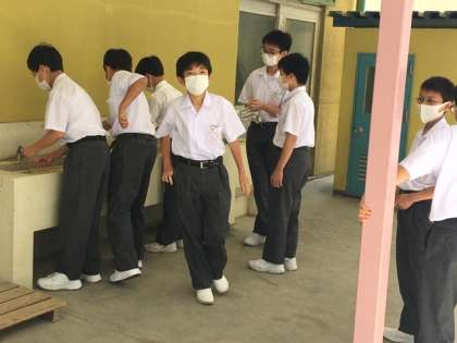 3限終了後、分散して手洗い場に行きます。このクラスは1階と2階の手洗い場に分かれます。